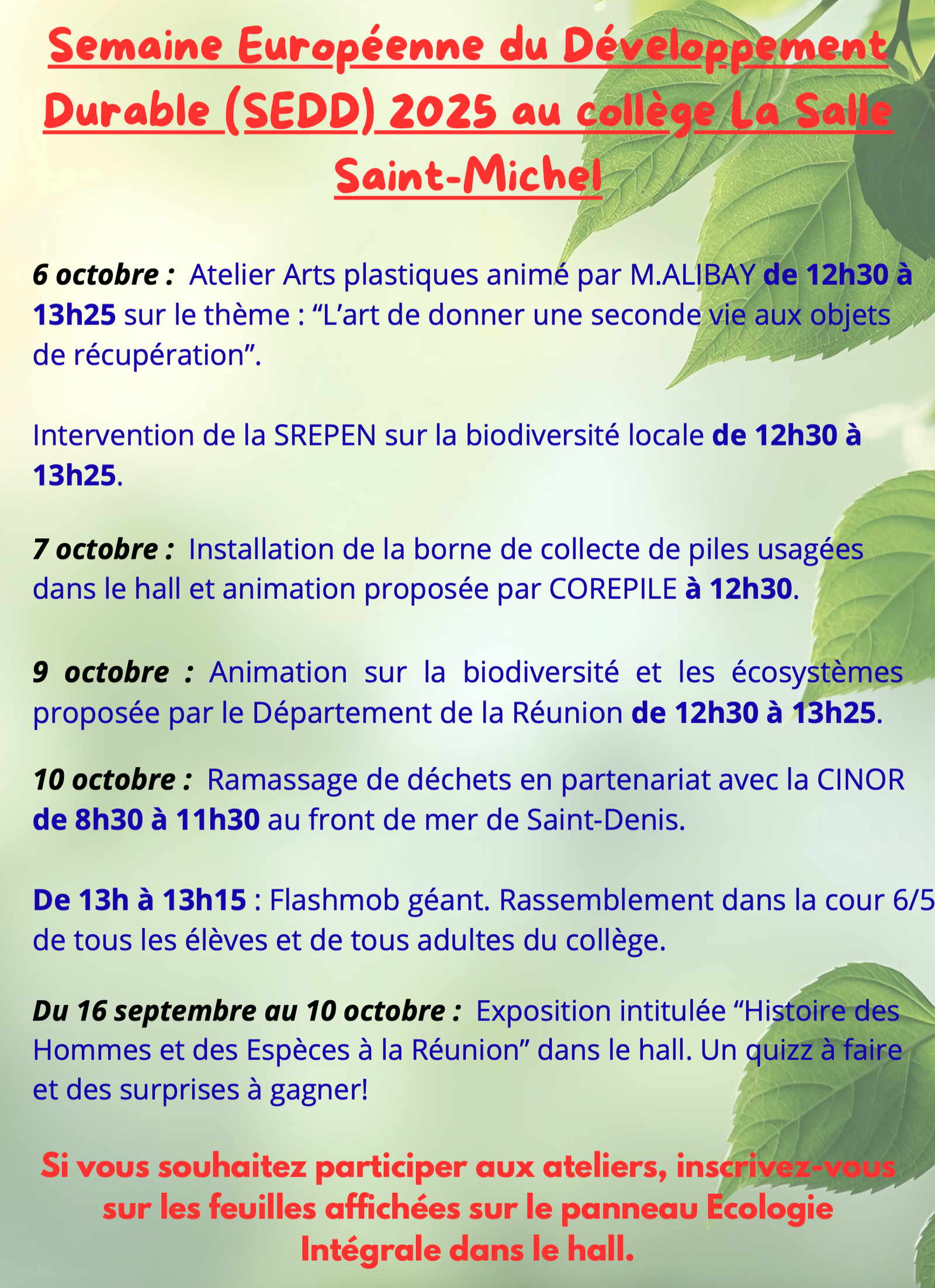 Depuis quelques années, l’un des événements phares du projet Écologie Intégrale à Saint-Michel est la Semaine Européenne du Développement Durable, qui s’est déroulée du 6 au 10 octobre 2025.